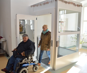 Eine Welt ohne Barrieren nutzt uns allen. Einer wachsenden Zahl älterer Menschen ebenso wie kleinen Kindern, Eltern mit Kinderwagen und allen, die vorübergehend in ihrer Mobiliät eingeschränkt sind. Mit einem barrierefreien Fußweg am Schlossplatz, der zum Ärztehaus und Einkaufsmarkt führt, und einem eingebauten Fahrstuhl im Verwaltungsgebäude, haben ca 100 Rollstuhlfahrer unserer Einrichtung ein weiteres Stück Selbständigkeit erhalten.