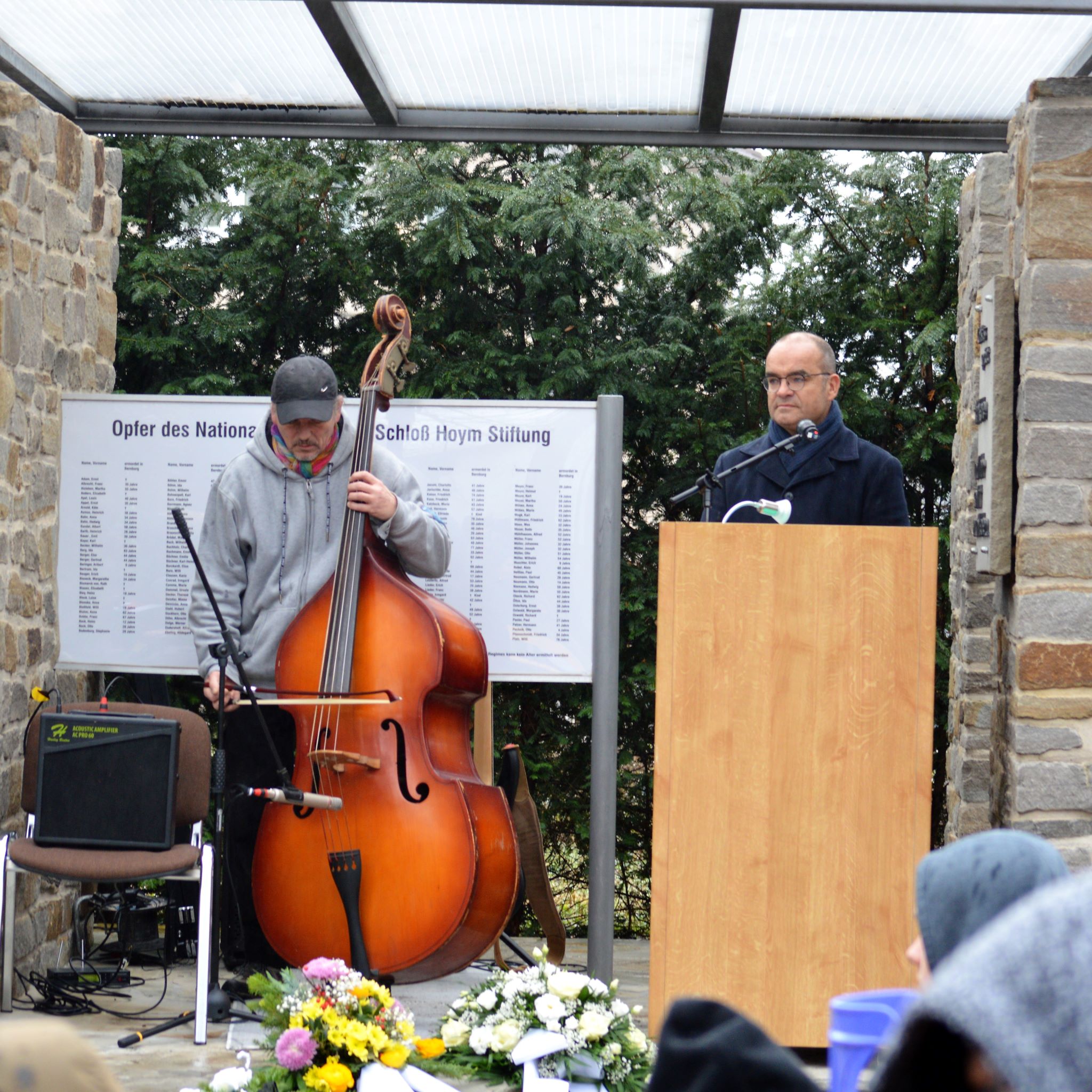 Der Geschäftsführer René Strutzberg eröffnete die Gedenkveranstaltung für die Opfer des Nationalsozialismus mit der Geschichte von Schloß Hoym und bedankte sich beim Förderverein „Freunde von Schloß Hoym e.V.“ und bei Adrian Maerevoet, dem ehemaligen Landesbehindertenbeauftragten Sachsen-Anhalts, für die Förderung der Stolperplatten. Mitarbeiter Falk Heyer begleitete mit Musikstücken auf dem Kontrabass und der Gitarre die Gedenkstunde. Dr. Sabine Schnierer hat die Geschichte von Emmy Luise Buchmann recherchiert und den leidvollen Lebensweg der jungen Frau bewegend beschrieben. Die Stolperplatte für Emmy Luise Buchmann wurde auf dem Stolperplattenpfad von dem stellvertretenden Bewohnerbeiratsvorsitzenden Klaus Janiska verlegt. Das geistliche Wort und Gottes Segen sprach Kreisoberpfarrer Dr. Theodor Hering.