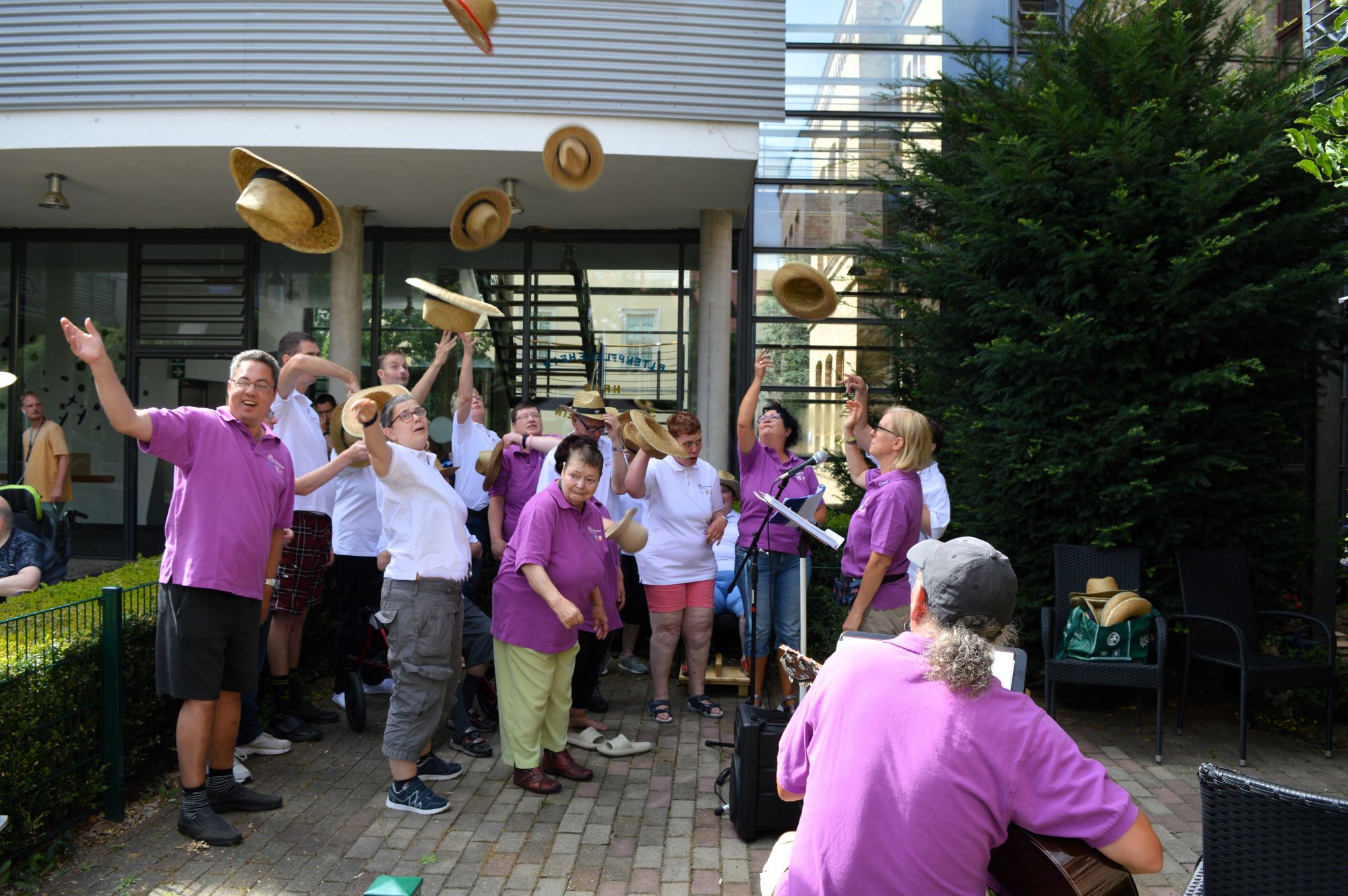 Der Schloss-Chor war wieder Gast im/am Haus Sonnenschein. Draußen auf der Terrasse gaben wir am 18.07.23 unser diesjähriges Sommerkonzert, und wussten eigentlich gar nicht, in welche Richtung wir singen sollten. Rundherum standen Leute, die gekommen waren, um zuzuhören aber auch kräftig mitzusingen. Denn das alte Volksliedgut ist bei vielen sehr bekannt und vor allem natürlich auch bei den Bewohnern im Haus Sonnenschein. Schön war es!