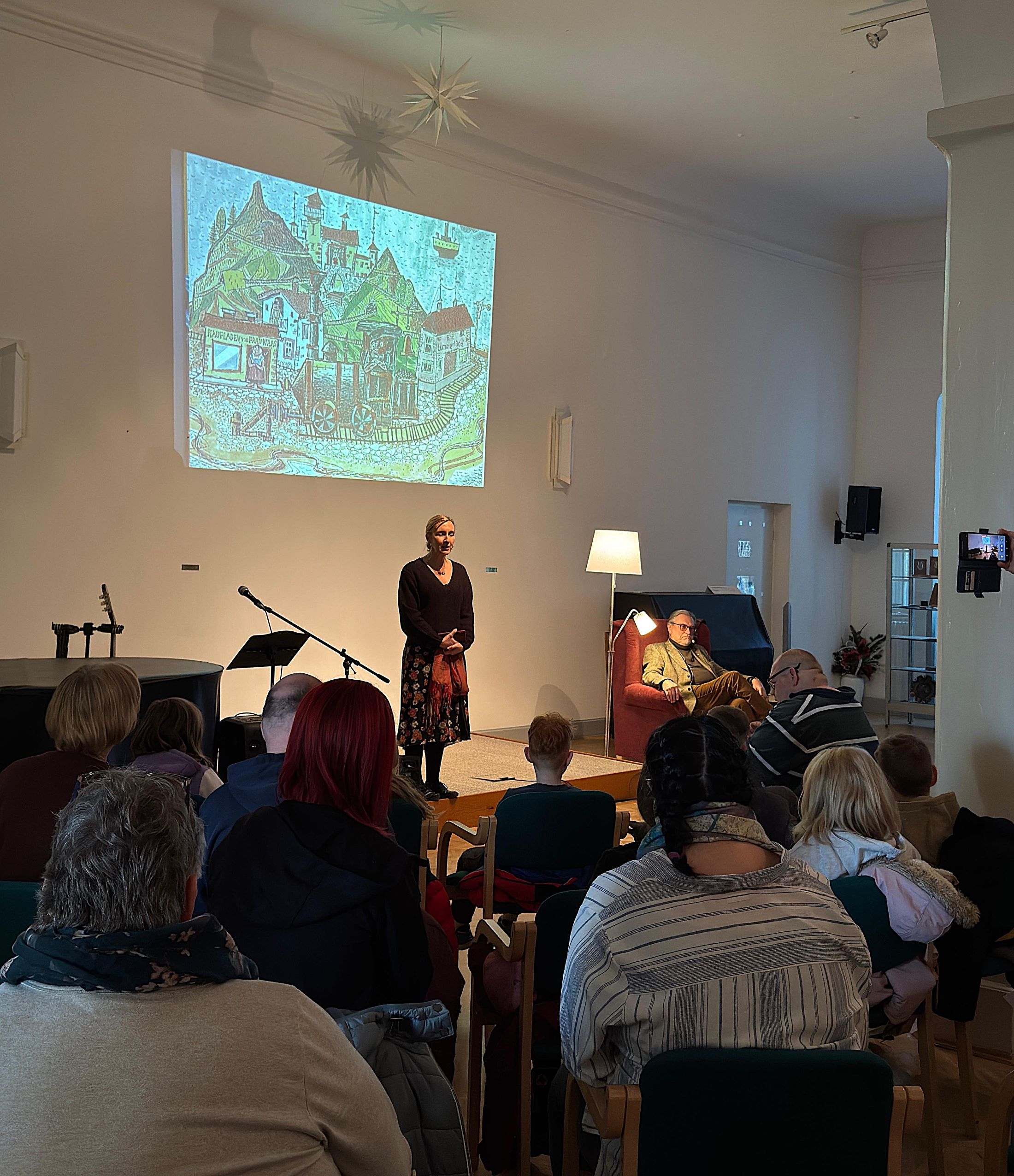 Seine durch Predigten der vielen Jahre geschulte Stimme war eine Freude für die zuhörenden Ohren. Mal fröhlich, düster oder überraschend, je nachdem, wie es gerade zu der Geschichte der beiden Lokomotivführer passte. Die Lesefantasie der Zuhörer wurde geweckt. Unser Kügelgensaal war gefüllt bis auf den letzten Platz, genau 116 Zuhörer lauschten gespannt der Geschichte von Jim Knopf und Lukas der Lokomotivführer. Unter ihnen waren viele Bewohner*innen und die begleitenden Mitarbeitenden aber auch 2 Schulklassen der Grundschule Prinzenhaus Hoym. Auflockerungsübungen und kleine Bewegungseinheiten durch das „Team Beuge“ an passenden Stellen innerhalb der Lesung, trugen zum lebhaften Miteinander und zur Freude aller bei. Es wurde aber nicht nur gelesen, sondern diesmal auch gesungen. Eine Insel mit zwei Bergen, oder auch Lummerlandlied genannt, durfte nicht fehlen. Christina Härtling von der Schloß Hoym Stiftung lud 2-mal zum gemeinsamen Singen ein und begleitete auf der Gitarre. Schließlich wohnen Jim Knopf und Lukas auf einer Insel mit 2 Bergen, genannt Lummerland