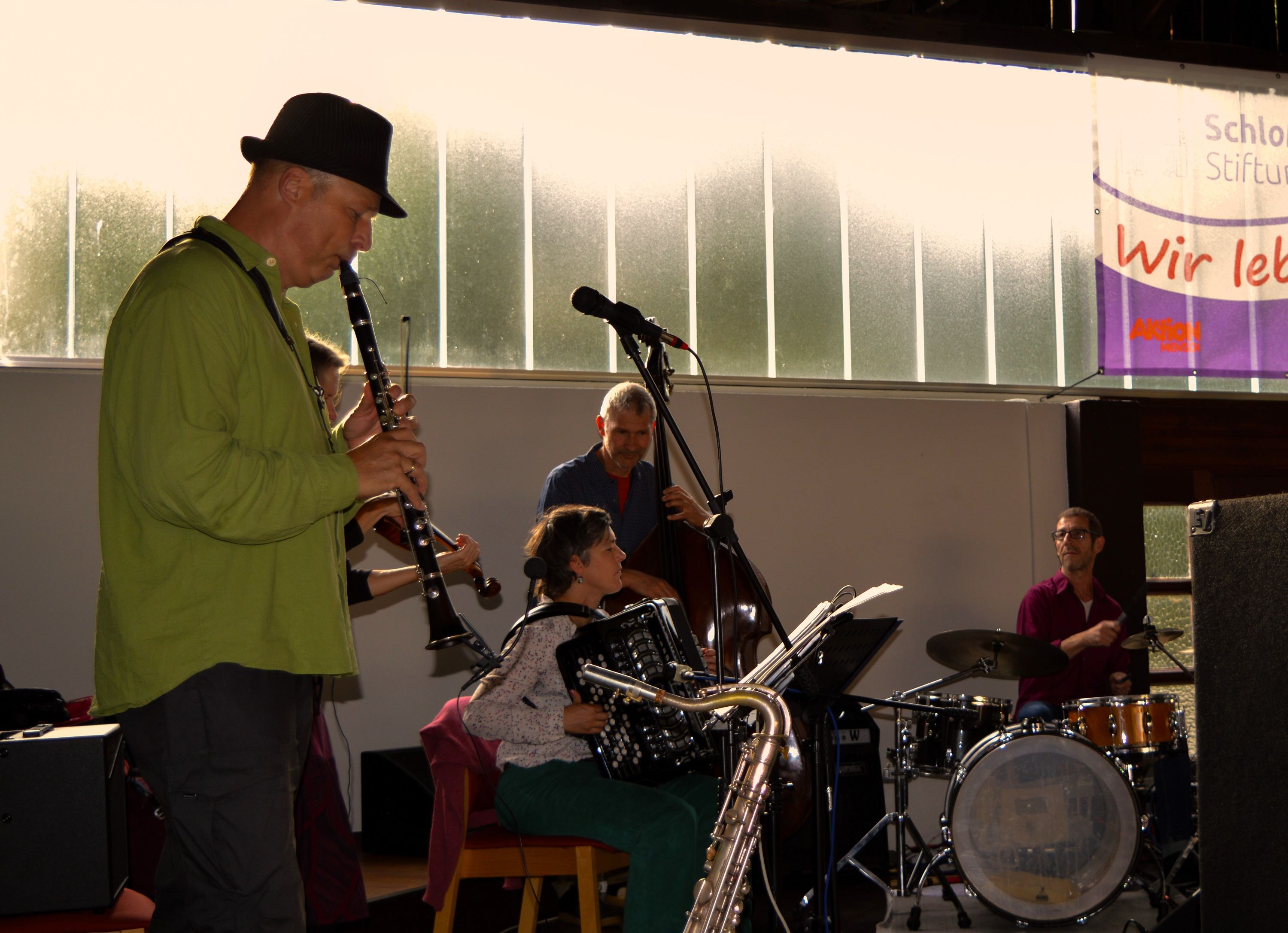 Bei spätsommerlichen Temperaturen und in einer liebevoll herbstlich gestalteten Festscheune kam ab 16 Uhr mit traditionellen Klängen aber auch eigenen Kompositionen auf Klarinette, Saxophon, Geige, Akkordeon, Kontrabass und Schlagzeug richtig Schwung auf und ging in die Beine. Alle Tänze wurden vom Tanzmeister angeleitet, begleitet und angepasst. Dabei wurden unsere Bewohner*innen durch langjährige Folk-Tänzerinnen des Halberstädter Folktanzvereins unterstützt.